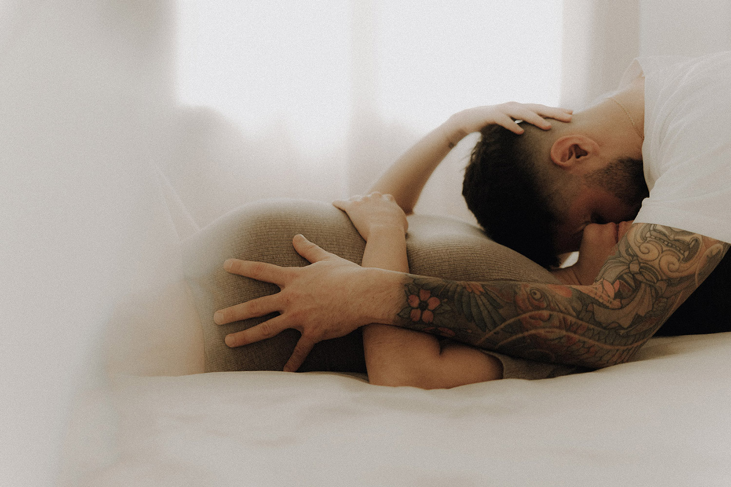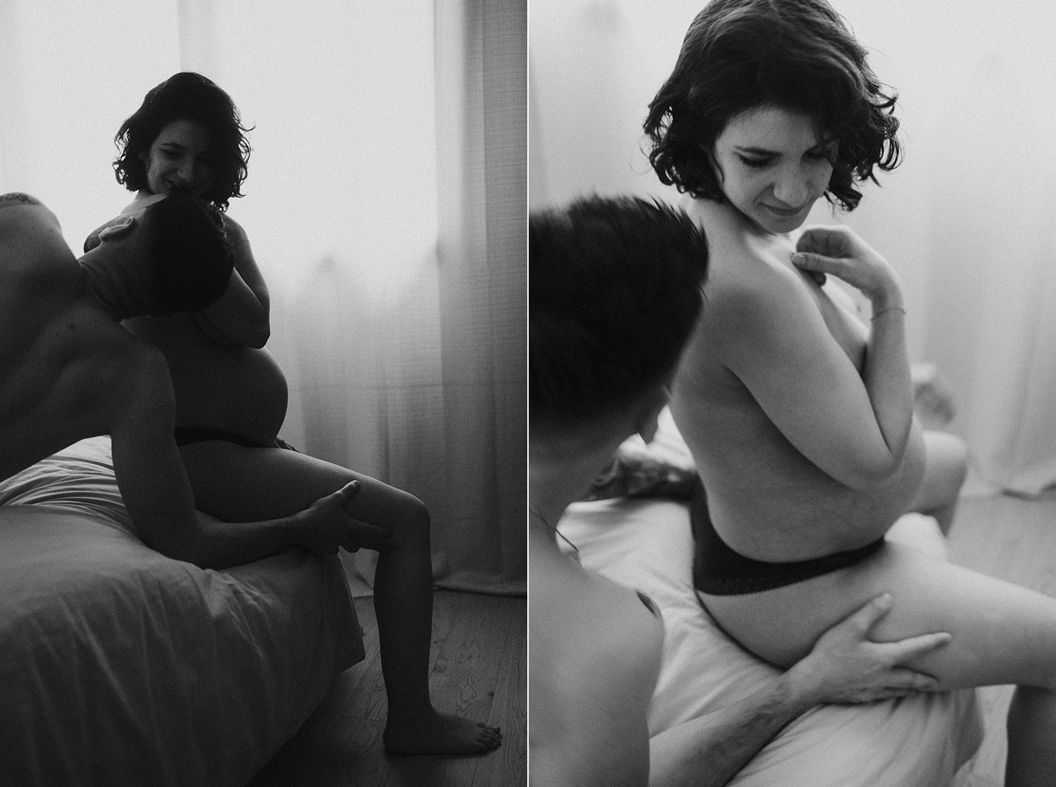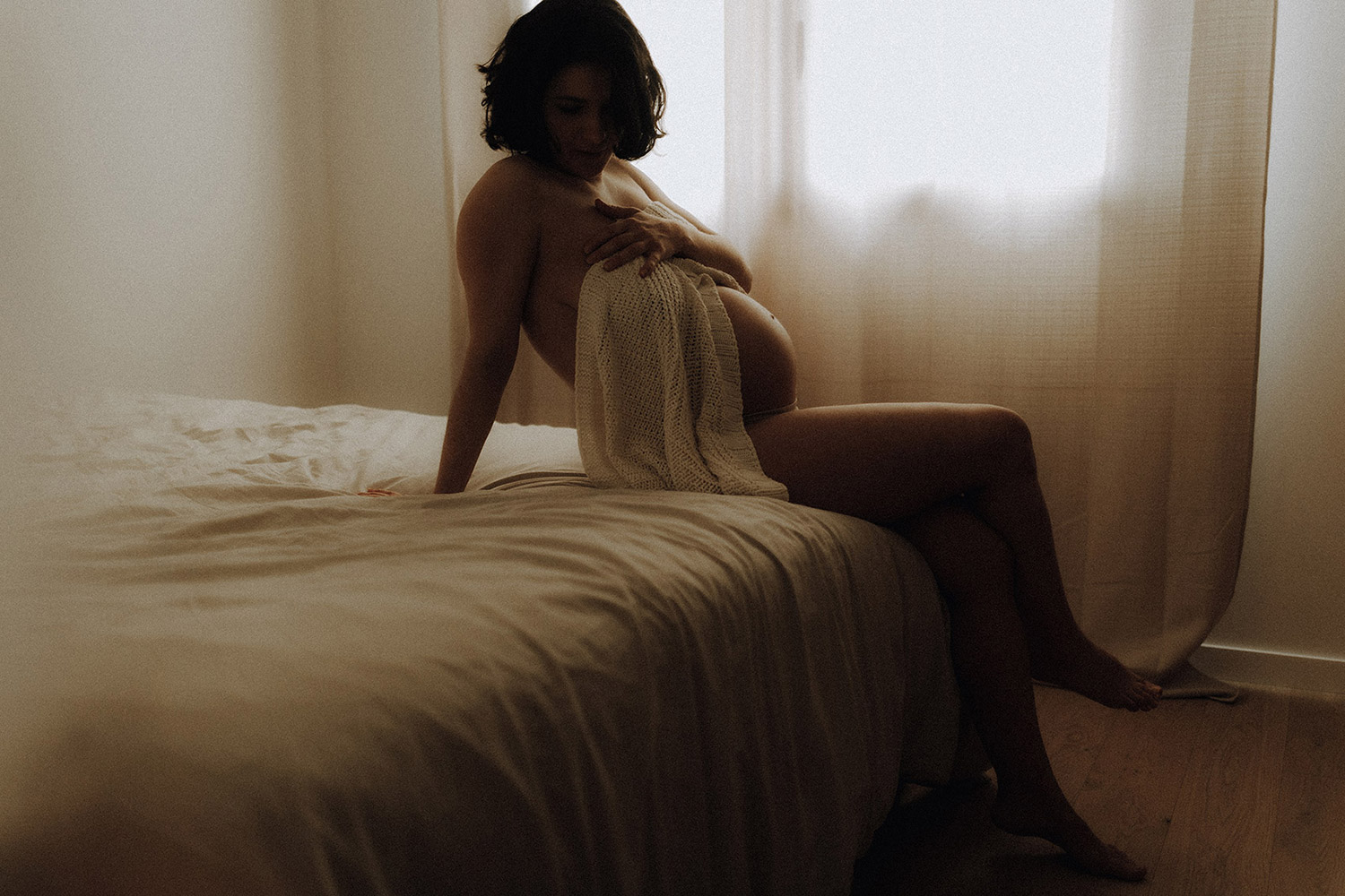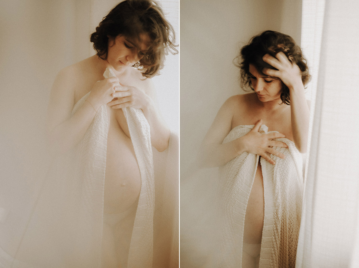 Raconter l’attente d’un bébé, c’est indéniablement dans l’intimité du couple, du corps et du coeur où pour moi se trouve l’évidence d’une attente. Une vérité. Ce n’est pas simplement dévoiler un corps, une peau, un monde qui s’arrondit, c’est surtout laisser l’amour et les sentiments prendre toute la place. Et cette place, cet espace sûr qu’est alors devenue leur chambre, Elise & Christophe en on remplit tous les espaces avec du vrai de leur couple. Les mains qui parlent, les yeux qui bouffent, c’est exactement ce que je cherche à voler toujours et qu’ils m’ont naturellement confiée. J’ai pu alors créer une série d’images fortes et douces à la fois, qui pour moi colle à merveille à leur intensité qui m’a été si inspirante et sur laquelle j’ai adoré poser mon oeil et ma lumière*