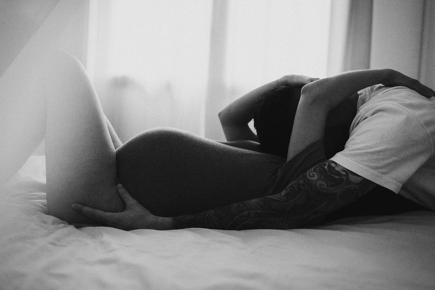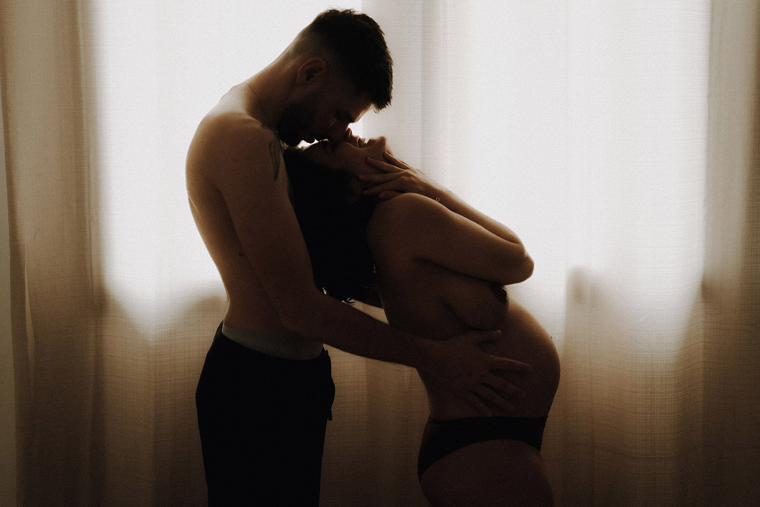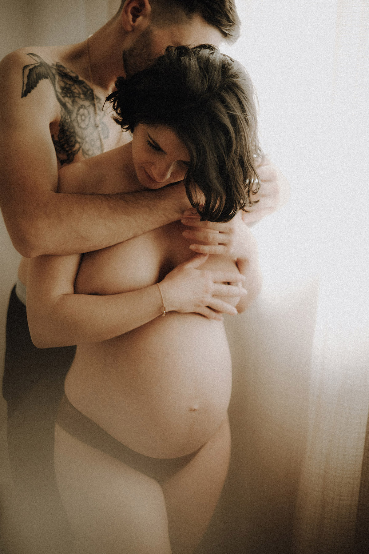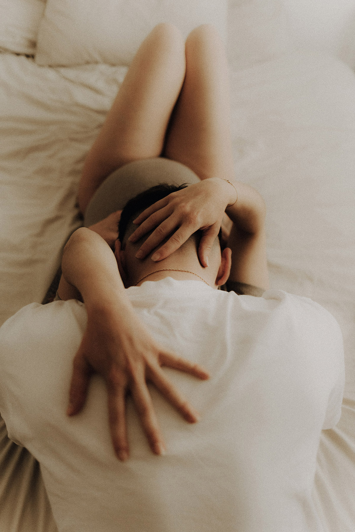 Raconter l’attente d’un bébé, c’est indéniablement dans l’intimité du couple, du corps et du coeur où pour moi se trouve l’évidence d’une attente. Une vérité. Ce n’est pas simplement dévoiler un corps, une peau, un monde qui s’arrondit, c’est surtout laisser l’amour et les sentiments prendre toute la place. Et cette place, cet espace sûr qu’est alors devenue leur chambre, Elise & Christophe en on remplit tous les espaces avec du vrai de leur couple. Les mains qui parlent, les yeux qui bouffent, c’est exactement ce que je cherche à voler toujours et qu’ils m’ont naturellement confiée. J’ai pu alors créer une série d’images fortes et douces à la fois, qui pour moi colle à merveille à leur intensité qui m’a été si inspirante et sur laquelle j’ai adoré poser mon oeil et ma lumière*