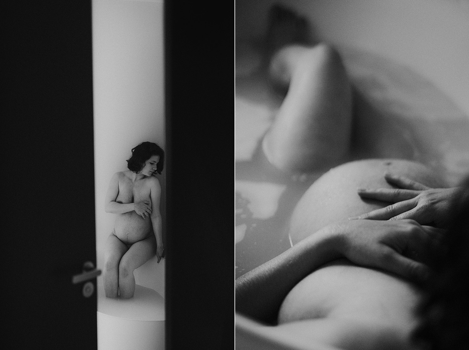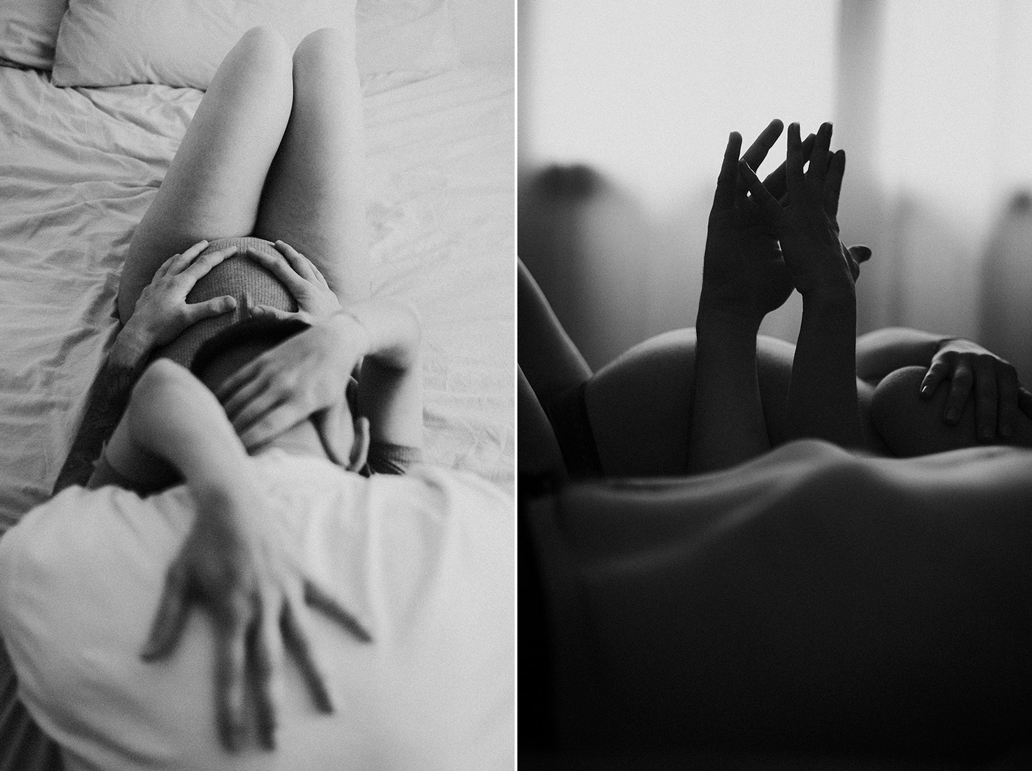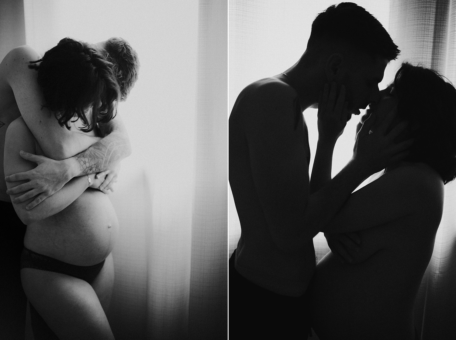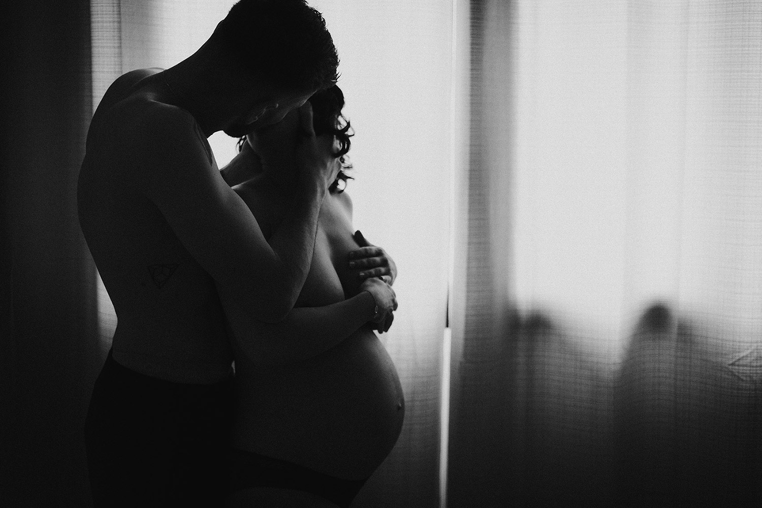 Raconter l’attente d’un bébé, c’est indéniablement dans l’intimité du couple, du corps et du coeur où pour moi se trouve l’évidence d’une attente. Une vérité. Ce n’est pas simplement dévoiler un corps, une peau, un monde qui s’arrondit, c’est surtout laisser l’amour et les sentiments prendre toute la place. Et cette place, cet espace sûr qu’est alors devenue leur chambre, Elise & Christophe en on remplit tous les espaces avec du vrai de leur couple. Les mains qui parlent, les yeux qui bouffent, c’est exactement ce que je cherche à voler toujours et qu’ils m’ont naturellement confiée. J’ai pu alors créer une série d’images fortes et douces à la fois, qui pour moi colle à merveille à leur intensité qui m’a été si inspirante et sur laquelle j’ai adoré poser mon oeil et ma lumière*