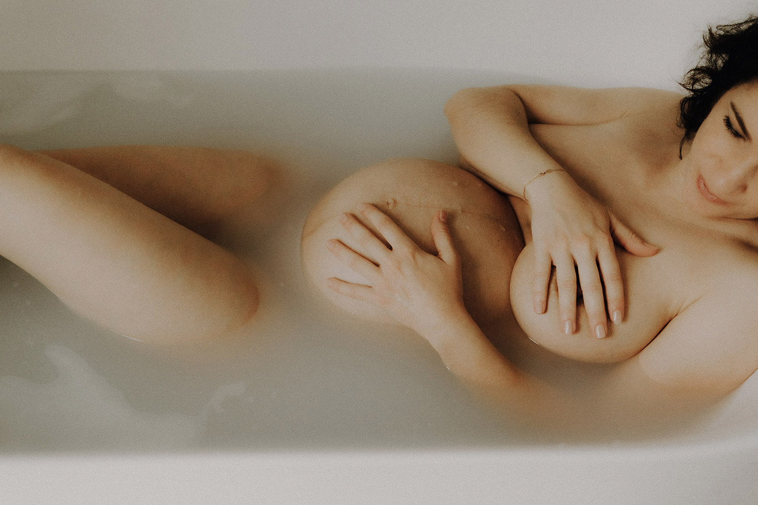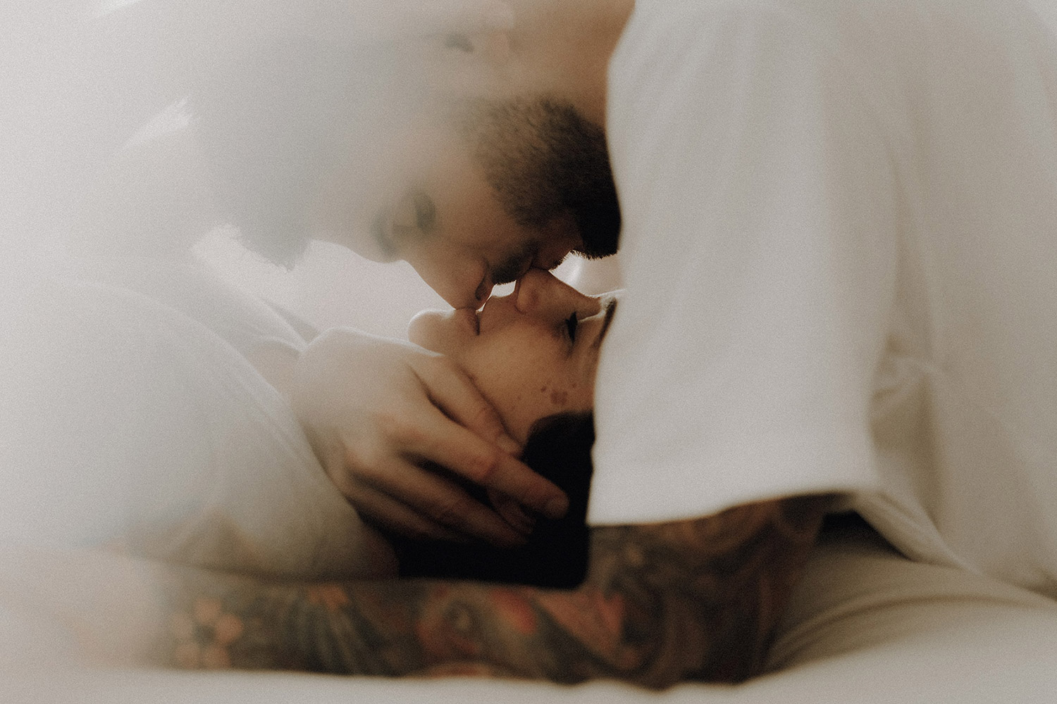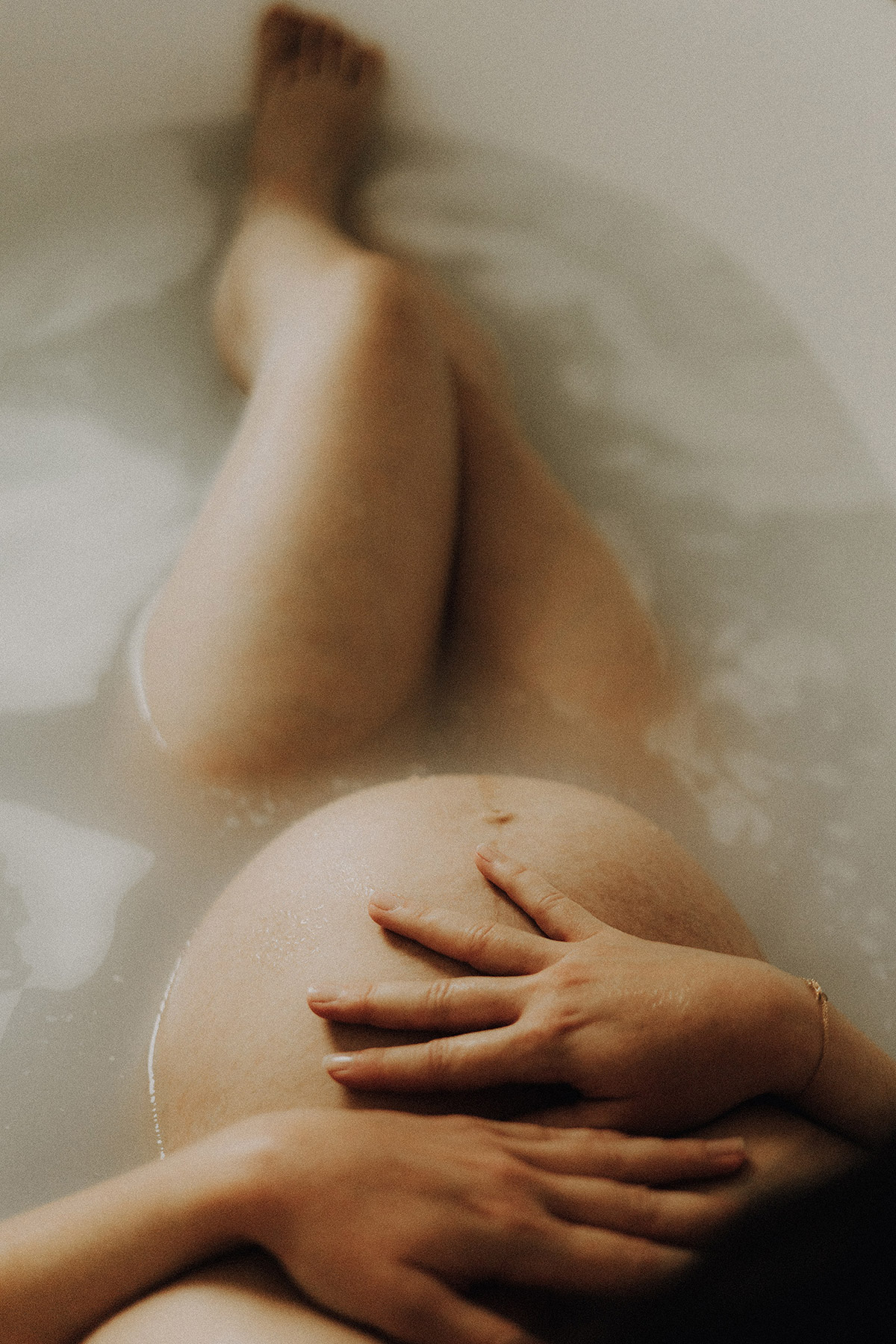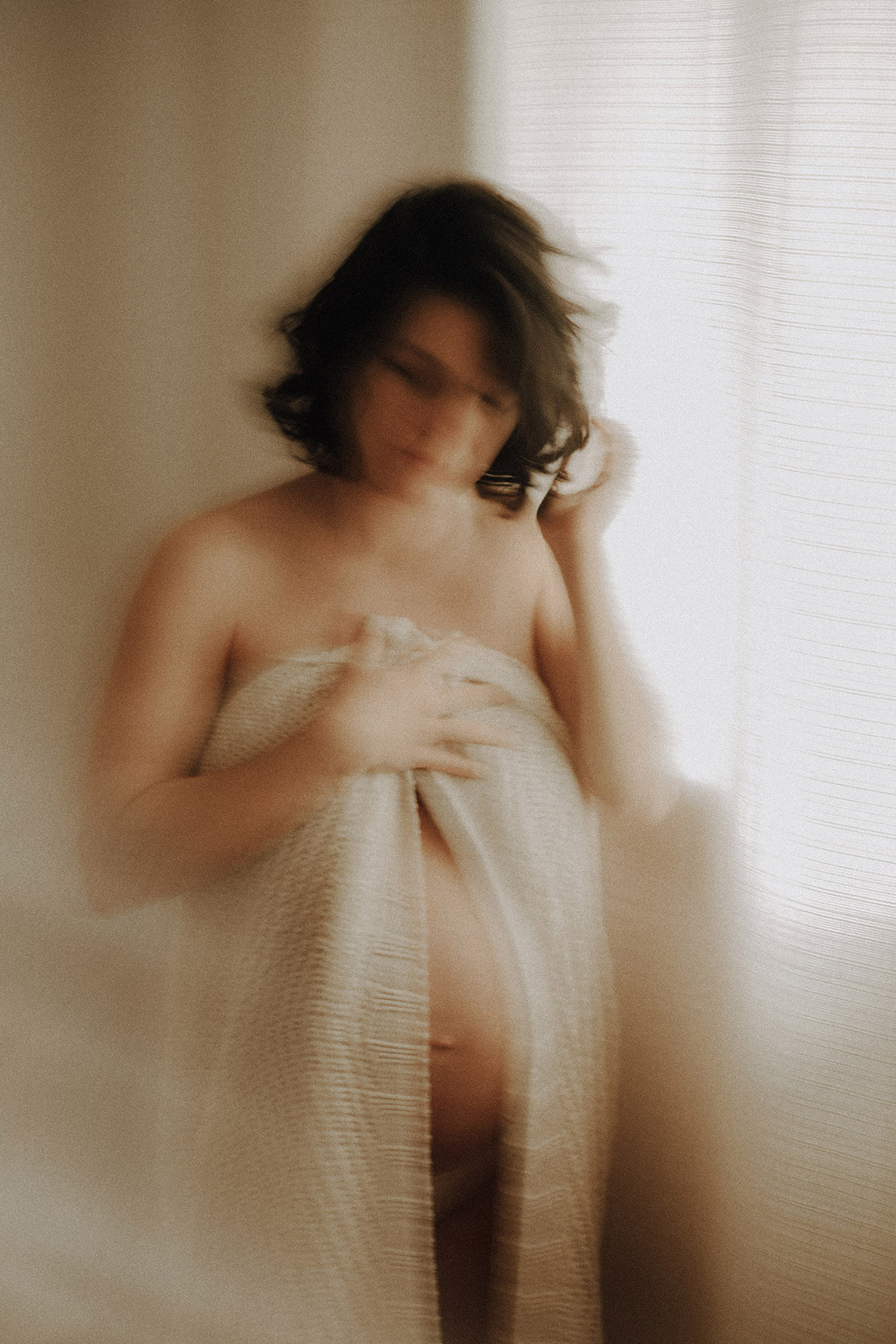 Raconter l’attente d’un bébé, c’est indéniablement dans l’intimité du couple, du corps et du coeur où pour moi se trouve l’évidence d’une attente. Une vérité. Ce n’est pas simplement dévoiler un corps, une peau, un monde qui s’arrondit, c’est surtout laisser l’amour et les sentiments prendre toute la place. Et cette place, cet espace sûr qu’est alors devenue leur chambre, Elise & Christophe en on remplit tous les espaces avec du vrai de leur couple. Les mains qui parlent, les yeux qui bouffent, c’est exactement ce que je cherche à voler toujours et qu’ils m’ont naturellement confiée. J’ai pu alors créer une série d’images fortes et douces à la fois, qui pour moi colle à merveille à leur intensité qui m’a été si inspirante et sur laquelle j’ai adoré poser mon oeil et ma lumière*